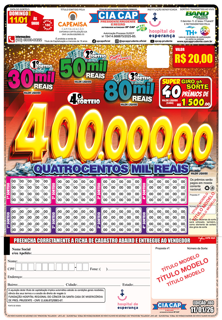 Além de concorrer a valiosos prêmios, você ajuda a Fundação Hospital Regional do Câncer da Santa Casa de Misericórdia de Presidente Prudente, cedendo o direito de resgate do título.