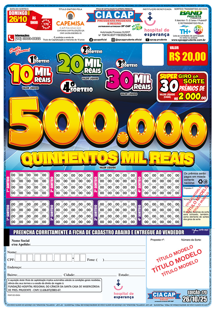 Título de Capitalização da Modalidade Filantropia Premiável de Contribuição Única, emitido pela CAPEMISA Capitalização S/A, CNPJ 14.056.028/0001-55, aprovado pelo Processo SUSEP que consta no Título. CONTATO LOCAL: [18] 3903-0822 – SAC 0800 940 1130. OUVIDORIA 0800 707 4936, de segunda a sexta-feira, das 8h às 17h. É proibida a venda de título de capitalização a menores de dezesseis anos. O valor não exigido dentro do prazo prescricional, estabelecido pela legislação em vigor, acarretará a perda desse direito. A aquisição deste título faculta ao adquirente a cessão de 100% do direito de resgate à FUNDAÇÃO HOSPITAL REGIONAL DO CÂNCER DA SANTA CASA DE MISERICÓRDIA DE PRESIDENTE PRUDENTE – HOSPITAL DE ESPERANÇA, certificada nos termos da legislação em vigor. Antes de contratar consulte previamente as Condições Gerais. As condições contratuais/regulamento deste produto protocolizadas pela sociedade junto à SUSEP poderão ser consultadas no endereço eletrônico www.susep.gov.br, de acordo com o número de processo constante da proposta. Prêmios líquidos de imposto de renda. Confira o resultado dos sorteios e as condições de participação em https://ciacapprudente.com.br. Imagens meramente ilustrativas.”
