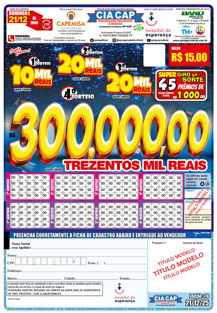 Título de Capitalização da Modalidade Filantropia Premiável de Contribuição Única, emitido pela CAPEMISA Capitalização S/A, CNPJ 14.056.028/0001-55, aprovado pelo Processo SUSEP que consta no Título. CONTATO LOCAL: [18] 3903-0822 – SAC 0800 940 1130. OUVIDORIA 0800 707 4936, de segunda a sexta-feira, das 8h às 17h. É proibida a venda de título de capitalização a menores de dezesseis anos. O valor não exigido dentro do prazo prescricional, estabelecido pela legislação em vigor, acarretará a perda desse direito. A aquisição deste título faculta ao adquirente a cessão de 100% do direito de resgate à FUNDAÇÃO HOSPITAL REGIONAL DO CÂNCER DA SANTA CASA DE MISERICÓRDIA DE PRESIDENTE PRUDENTE – HOSPITAL DE ESPERANÇA, certificada nos termos da legislação em vigor. Antes de contratar consulte previamente as Condições Gerais. As condições contratuais/regulamento deste produto protocolizadas pela sociedade junto à SUSEP poderão ser consultadas no endereço eletrônico www.susep.gov.br, de acordo com o número de processo constante da proposta. Prêmios líquidos de imposto de renda. Confira o resultado dos sorteios e as condições de participação em https://ciacapprudente.com.br. Imagens meramente ilustrativas.”