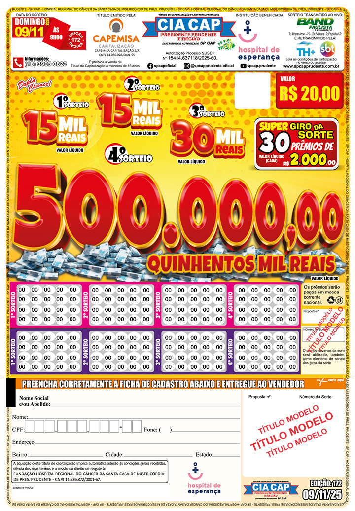 Título de Capitalização da Modalidade Filantropia Premiável de Contribuição Única, emitido pela CAPEMISA Capitalização S/A, CNPJ 14.056.028/0001-55, aprovado pelo Processo SUSEP que consta no Título. CONTATO LOCAL: [18] 3903-0822 – SAC 0800 940 1130. OUVIDORIA 0800 707 4936, de segunda a sexta-feira, das 8h às 17h. É proibida a venda de título de capitalização a menores de dezesseis anos. O valor não exigido dentro do prazo prescricional, estabelecido pela legislação em vigor, acarretará a perda desse direito. A aquisição deste título faculta ao adquirente a cessão de 100% do direito de resgate à FUNDAÇÃO HOSPITAL REGIONAL DO CÂNCER DA SANTA CASA DE MISERICÓRDIA DE PRESIDENTE PRUDENTE – HOSPITAL DE ESPERANÇA, certificada nos termos da legislação em vigor. Antes de contratar consulte previamente as Condições Gerais. As condições contratuais/regulamento deste produto protocolizadas pela sociedade junto à SUSEP poderão ser consultadas no endereço eletrônico www.susep.gov.br, de acordo com o número de processo constante da proposta. Prêmios líquidos de imposto de renda. Confira o resultado dos sorteios e as condições de participação em https://ciacapprudente.com.br. Imagens meramente ilustrativas.”